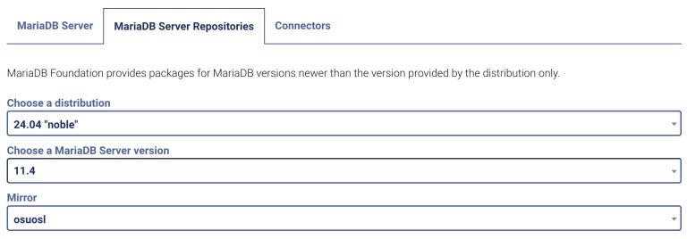 You'll need to select an Ubuntu distribution, the MariaDB Server version (11.4) and a Mirror